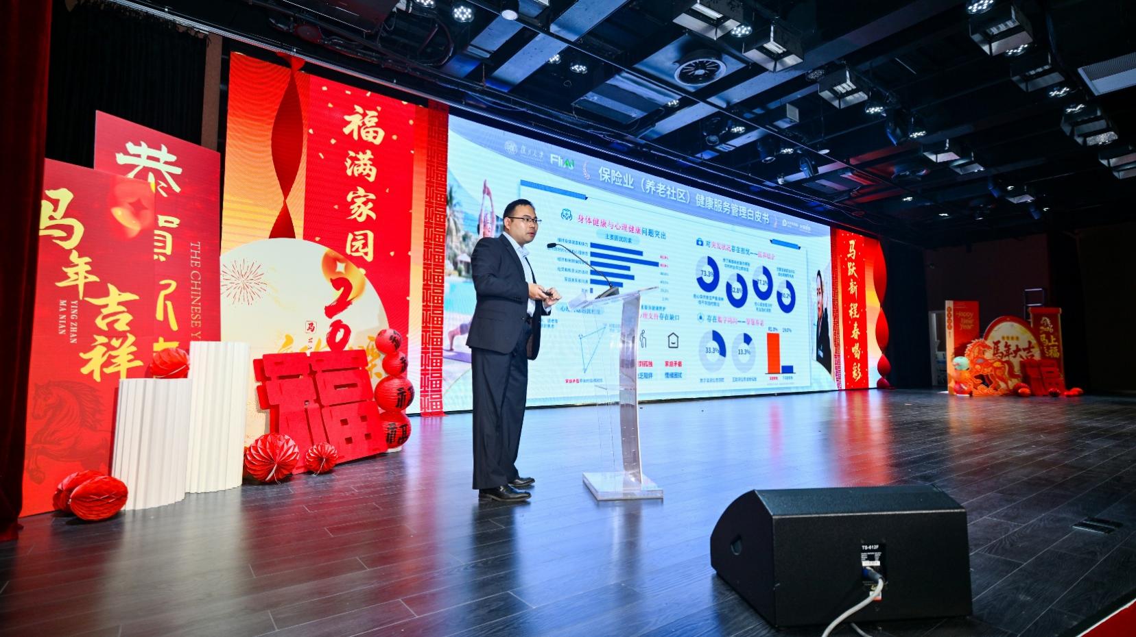 12月20日,在复旦大学与中国太保联合主办的长三角“双阳杯”养老社区艺术节总汇演暨“守护记忆·守护爱”认知健康公益行活动现场,复旦大学保险应用创新研究院(以下简称“研究院”)联合复旦大学公共卫生学院与太平洋保险养老产业投资管理有限责任公司共同编制的《保险业(养老社区)健康服务管理白皮书(2025)》(以下简称“白皮书”)正式发布,并由研究院副院长贾英男具体介绍了白皮书的主要内容。