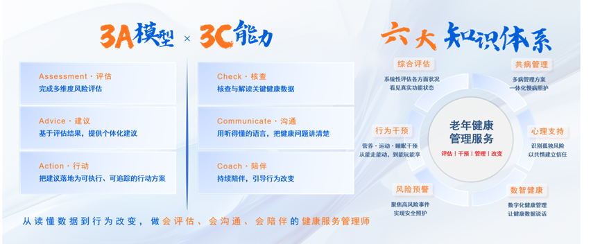 针对供需痛点,白皮书创新性提出健康服务管理人才的赋能路径,构建起“评估(Assessment)”→“建议(Advice)”→“行动(Action)”的3A服务模型,着力提升 “核查(Check)、沟通(Communicate)、陪伴(Coach)”的3C核心能力,围绕综合评估、共病管理、行为干预、心理支持、风险预警、数智健康六大知识模块,通过核心理论精讲、真实案例研讨、沉浸情景模拟、关键技能实训、服务现场实战及督导评估反馈等多元授课方式,全力打造 “会评估、会沟通、会陪伴” 的专业化健康服务管理师队伍。