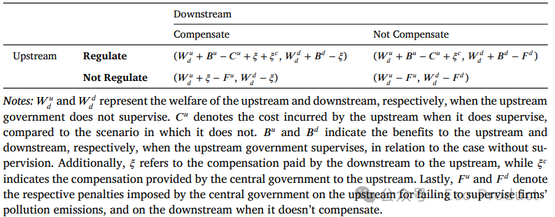 表2则展示了中央政府的核心作用。中央政府通过两种方式改变博弈格局:一是提供额外补偿𝜉𝑐,直接激励上游政府;二是引入惩罚机制(𝐹𝑢和 𝐹𝑑),对违约方(上游不监管或下游不补偿)进行惩处。这使得遵守协议(监管+补偿)成为双方新的、更优的纳什均衡。