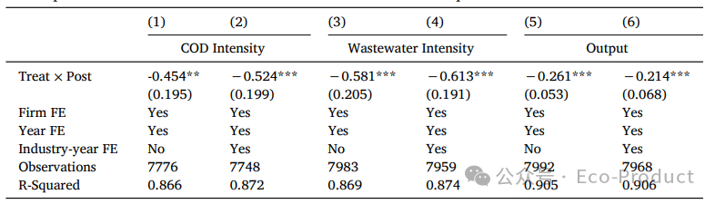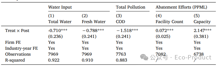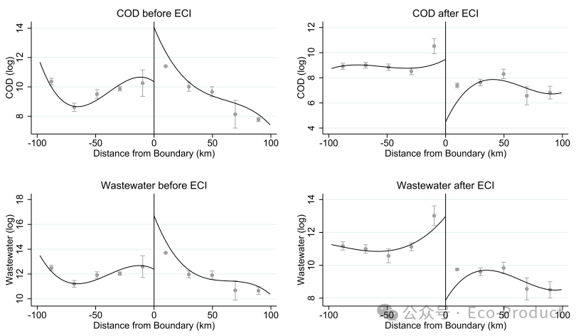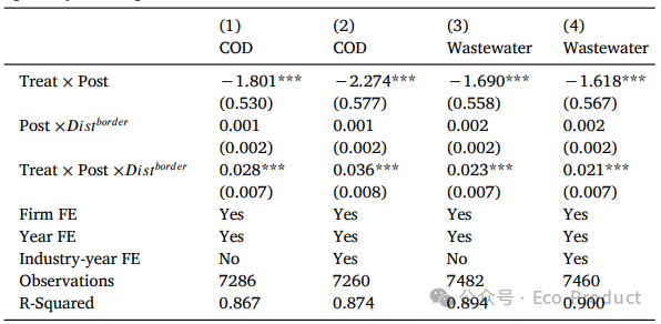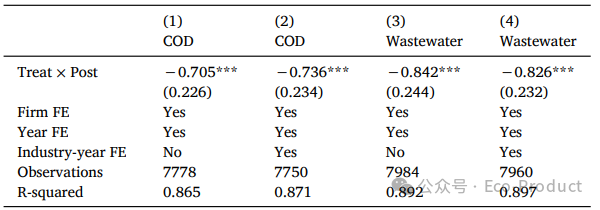 表3显示,ECI使得上游企业的COD排放显著降低了44%,证实其污染治理有效性。