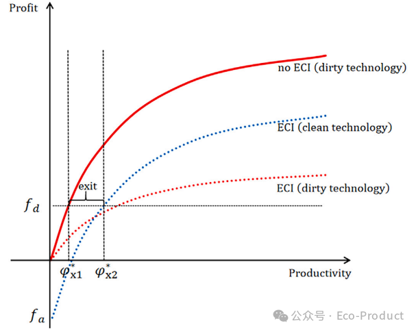 模型首先刻画了企业的生产与排污行为。企业使用资本进行生产,其产出会线性地产生污染。企业可以选择采用清洁技术,这需要支付固定成本但能降低排放强度;或者选择传统技术,但面临被环保部门检查并处罚的风险。如图4所示,企业的利润函数取决于其生产率和技术选择。模型推导出一个关键结论:与无政府监管的情形相比,政府强制推行环保法规将通过产出规模缩减(部分企业退出市场)和技术升级(存活企业采纳清洁技术)两种渠道共同降低污染水平。