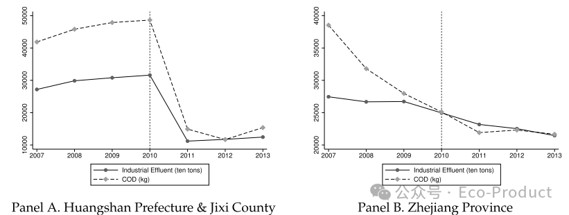 图3. 2007至2013年不同区域平均水污染物排放量。注:图A中每个点代表安徽省黄山市和歙县企业平均水污染物排放量;图B中每个点代表浙江省企业平均水污染物排放量。数据来源为生态环境部提供的《污染企业环境年度调查(2007-2013)》。