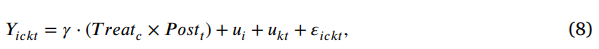 其中,被解释变量 𝑌ᵢₖₜ 为企业级污染物排放量;𝑇𝑟𝑒𝑎𝑡ₐ 为处理组虚拟变量(上游黄山市及绩溪县企业取1,下游杭州市企业取0);𝑃𝑜𝑠𝑡ₜ 为政策时点虚拟变量(2011年及之后取1)。系数 𝛾 捕捉ECI对上游企业的处理效应。模型控制企业固定效应(𝑢ᵢ)和行业×年份固定效应(𝑢ₖₜ),标准误聚类到县×年层面。