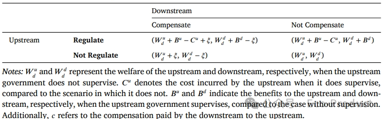 表1展示了为何谈判会失败。这是一个典型的“囚徒困境”。如果上游选择监管且下游选择补偿,双方总福利最高。但由于存在行动先后顺序和承诺问题:若上游先投资减排,下游事后有动机拒绝支付补偿;若下游先支付补偿,上游事后有动机不严格监管。预期到对方会违约,双方的最优策略都是选择“不监管/不补偿”,从而陷入非合作的纳什均衡,无法实现潜在的社会福利增益。