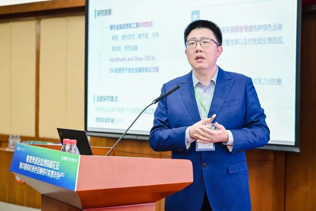 武汉大学齐绍洲教授致辞,他以“远见卓识”“恰如其时”“未来可期”概括本次会议:前者指高校绿色金融联盟蓬勃发展,中者契合“双碳”战略与大湾区发展机遇,后者寄望青年在绿色转型中把握机遇。